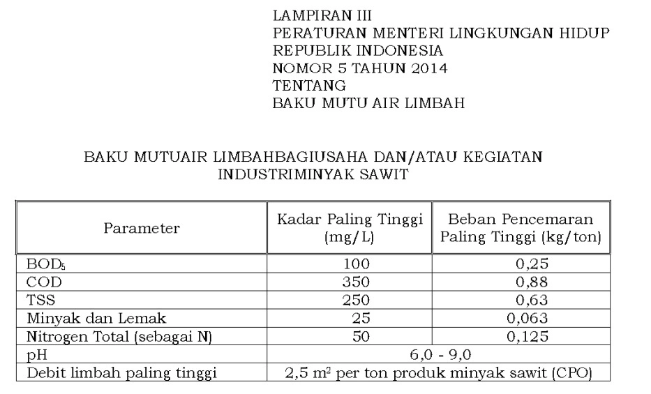 Pengolahan limbah industri wajib mengikuti regulasi pengolahan air limbah yang sudah diterapkan oleh pemerintah melalui regulasi lingkungan hidup. Salah satu regulasi yang digunakan pada industri sawit adalah Peraturan Menteri Lingkungan Hidup no. 5 tahun 2014, yang memiliki kelompok-kelompok baku mutu sesuai dengan jenis industrinya. Untuk industri pengolahan sawit, dapat menggunakan regulasi ini pada lampiran III. Kadar BOD wajib tidak boleh diatas angka 100 mg/L dan angka COD harus dibawah 350 mg/L. Jika dibandingkan dengan data limbah industri pada kasus ini, maka client harus bisa menurunkan COD hingga 98-99% dan penurunan BOD hingga 99%. Cukup menarik bukan?